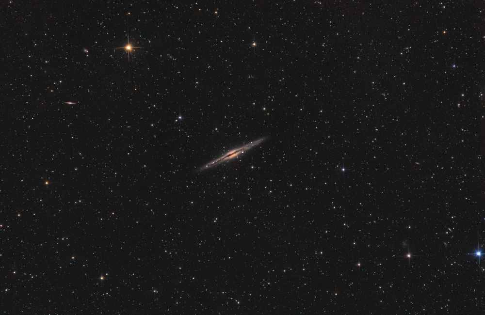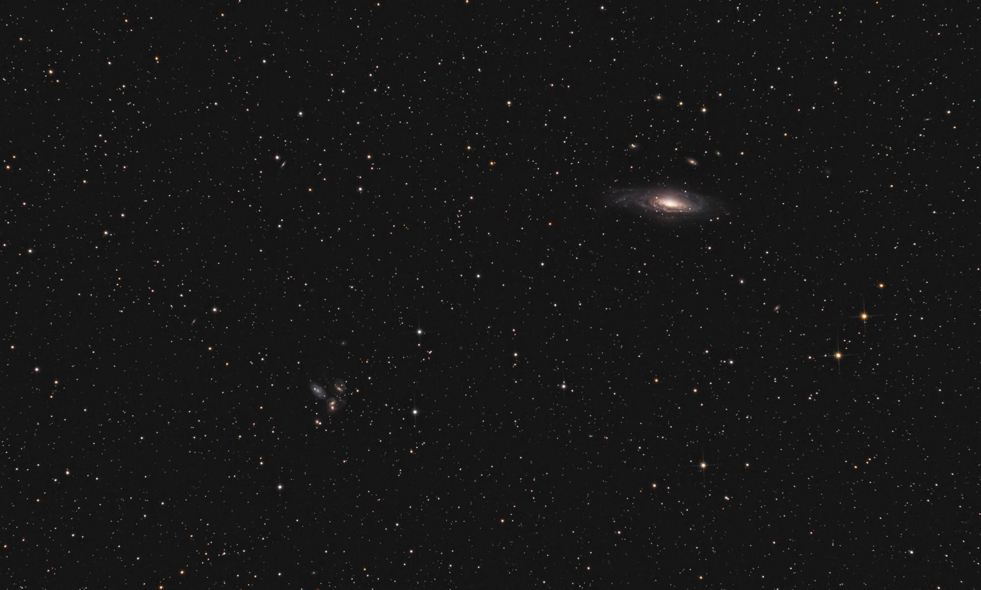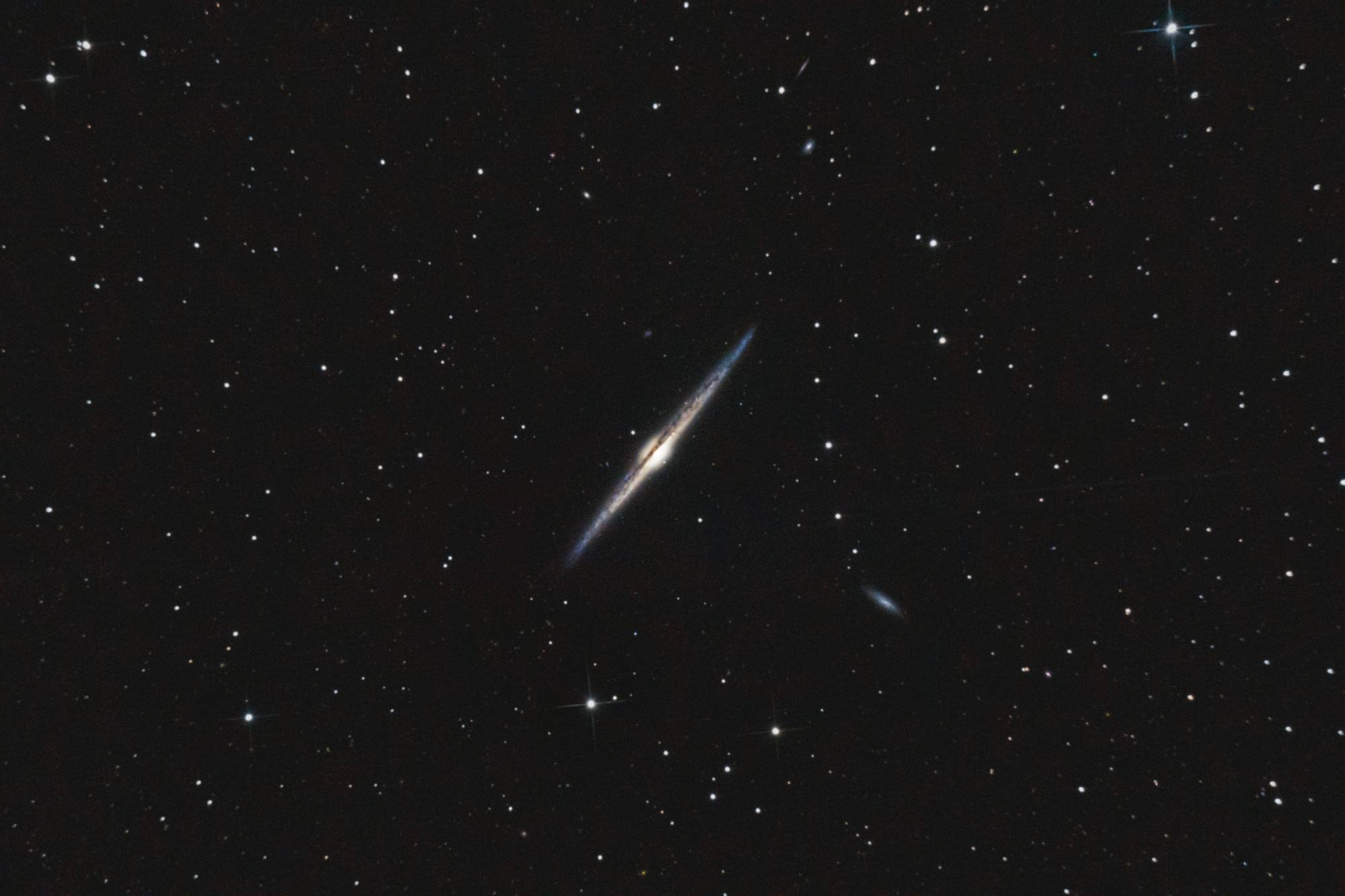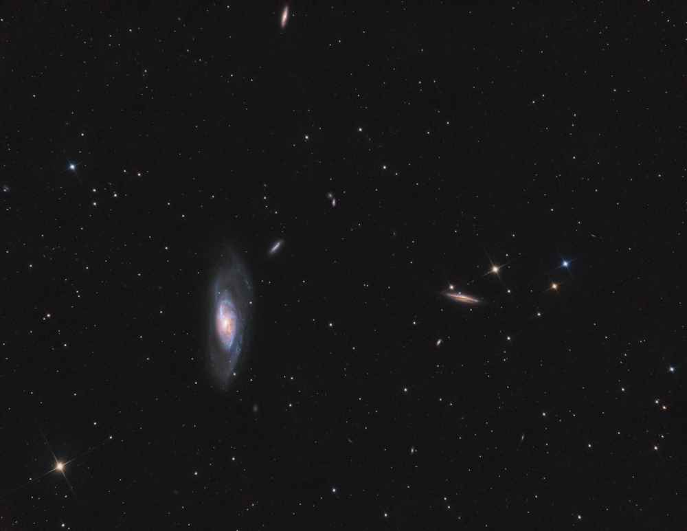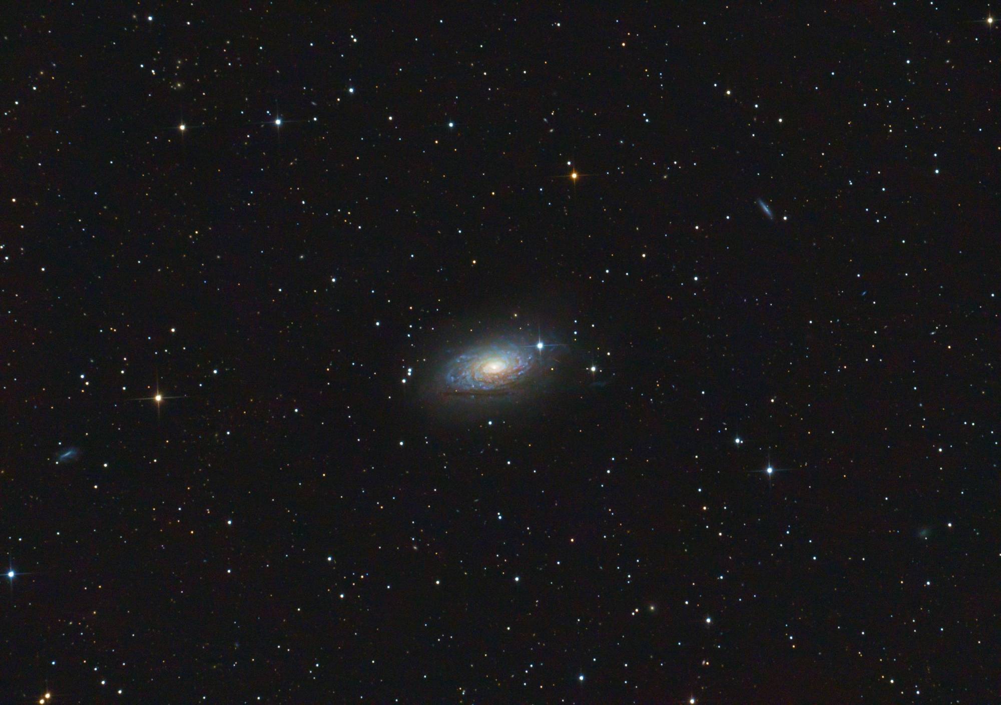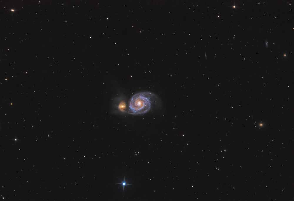 Mein Teleskop ist ein 8 Zoll Newton-Spiegelteleskop von Skywatcher, mit einer Brennweite von 1000mm und einer Blende von f/5. Das macht es relativ lichtstark für seine Größe. Dank des etwas breiteren Fangspiegels eignet es sich besonders gut für die Astrofotografie. Zusätzlich setze ich einen Komakorrektor von Baader ein, um die Sterne am Rand des Bildfelds zu korrigieren. Die Montierung ist eine Skywatcher EQ-6, die ich über einen Laptop steuere. Zum Guiding benutze ich ein Beroflex 300mm Objektiv. Als Software kommt APT (Astro Photography Tool), Stellarium, PHD2 und EQ-MOD zum Einsatz.